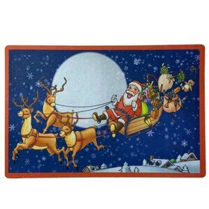 The Night Before Christmas Accent Mat Scatter Rug Doormat Holiday Decor is easy to love. With a nostalgic retro vintage scene of Santa and his Reindeer Drawn Sleigh full of toys dashing across a midnight blue sky. It’s sure to bring Holiday Cheer to your home year after year.