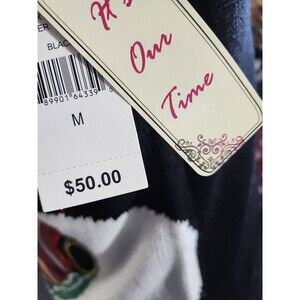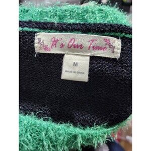 This festive sweater features Santa Claus in a red car on the front, perfect for the holiday season. Made from a blend of polyester, spandex, cotton, and acrylic, the sweater has a round neck, long sleeves with raglan sleeves, and a pullover style. The black sweater with striped sleeves is adorned with glitter and a bow, adding a touch of sparkle and charm. The sweater is sized M and designed for women, making it a fun and colorful addition to your Christmas holiday wardrobe.