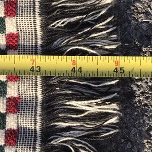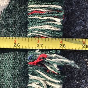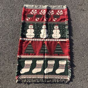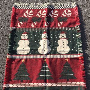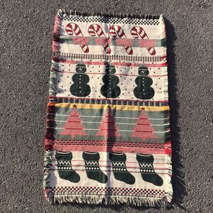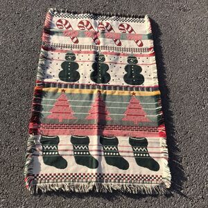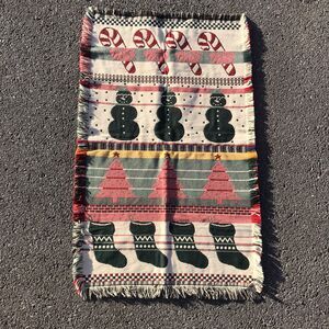 Christmas Holiday Fringed Woven Tapestry. Sofa Throw, Lap Rug Blanket, Textile Wall Hanging, Table Cover, so many ways to use. Measures approximately 28x45 inches and Heavyweight Cotton. It is in excellent condition. Red, Green and White, Christmas Colors and sporting Candy Canes, Snowmen, Christmas Trees and Christmas Stockings. So pretty!