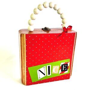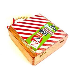 This fun and flirty holiday purse, with it's "Naughty or Nice" theme will really get you in the Christmas spirit! The wood cigar box has been transformed with candy cane stripes on the "NAUGHTY" side, and a red polka dot pattern on the "NICE" side! The bold magazine cut-out letters are layered on a bright green background. Choose how to carry the handbag depending on your mood! The finishing touch is a cute grosgrain ribbon bow and bell embellishment