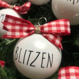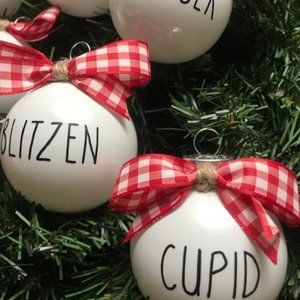 These Unique Fun Holiday Christmas Ornaments are made of White Plastic with each Reindeer name printed in Black Vinyl Lettering with Rudolph In a Red Vinyl Lettering. Fun Ribbon is attached to each ornament. Comes in a set of 9. (Greenery not Included!)