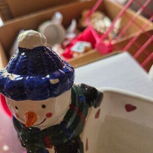 Ceramic Christmas Holiday Santa Claus and Snowman Cracker Dish or dip tray This would be nice to hold a row of crackers in for a party! PLEASE NOTICE THE BLUE HAT ON THE SNOWMAN, IT LOOKS LIKE A DEFECT OF PAINT OR SOMETHING, THIS HAS ONLY BEEN TAKEN OUT FOR PICTURES. Measures about 11.5 inches long, 4.75 inches tall and 3.25 inches wide. IT IS STILL IN ORIGINAL BOX WITH SYROFOAM.