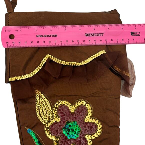 Christmas Holiday Stocking Caramel Brown Sequined Pink Flowers Elf Toe Stocking