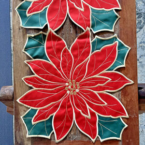 Christmas Holiday Table Runner Embroidered Poinsettia Red Green Holly Leaf