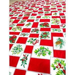 Vintage 1970s style Christmas Holiday Tablecloth - a Rectangle of brilliant Red Green & White with Poinsettias, Pinecones and Holly leaves all around. In good condition - no significant damage or flaws - absolutely charming!