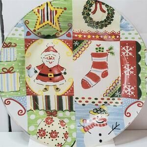 EUC: Festive, green/red/yellow/white/blue holiday glass serving plate/dish with a Christmas theme/clear glass plate/holiday lining underneath. In excellent pre-owned condition with no cracks or chips. **Disclosure: the under lining has air pockets. Hard to picture unless you feel and look closely- structurally intact. Hand wash only.