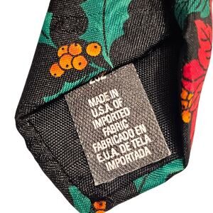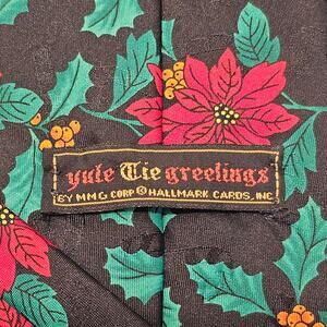 Hallmark "Yule Tie Greetings" Christmas necktie featuring red poinsettias, green holly leaves, and yellow berries on a black background. Made in the USA of imported fabric. Measures approximately 60" long and 3.5" wide at its widest point. 100% polyester. Dry clean only.