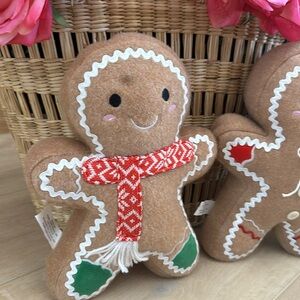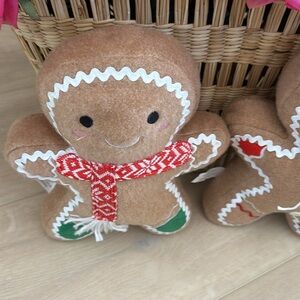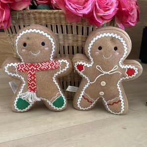 Christmas Holiday Gingerbread themed boy and girl plush. Heavy feet so they can stand on their own for display. Great for a kids Christmas basket. Super adorable plush pillow, doll, decoration. weighted bottom. Comes as a set. One boy and one girl