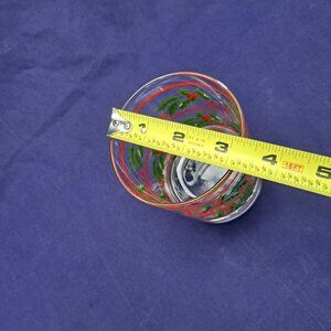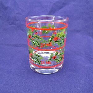 A festive old fashioned glass adorned with holly berry and red stripes, suitable for holiday gatherings and spirited celebrations.