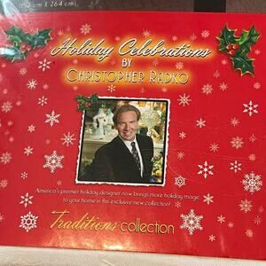 I believe this line was from around 2004. It is most likely vintage now. Tablecloth is unused but has been stored many years. I opened it to make sure it was ok inside. I noticed a little speck, a little nub and a red dot. Most of this is just the way it was made. It’s a beautiful tablecloth with a vintage inspired bow and holly border. There is a faint damask print in the ivory cream color. It may need of be washed before used. The packaging isn’t perfect and has some marks on it.