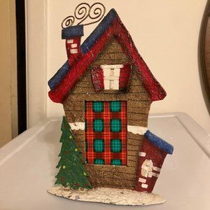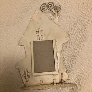 Christmas Home All Decked Out with Tree and Chimney. Made of Tin Metal. The Christmas Door Can be Replaced with a Picture. Picture Measures approximately 3.5" wide x 2.75" long. The Whole Home Measures approximately 6-1/2" wide x 10" long. Can Stand Upright.