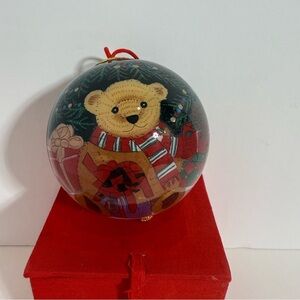 Christmas House Hand Painted Large Glass Ornament Teddy Bear Red Box