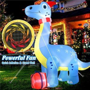 🧿【UNIQUE & INTERESTING DESIGN】9FT blue christmas dinosaur inflatable decoration wearing a christmas hat and holding a gift with a unique and fun design appeals to kids and neighbors. The built-in LED lights add more Christmas spirit to your yard when lit up, making your yard fun during the Christmas season.