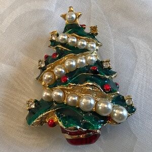 Christmas Tree Brooch with faux pearls and rhinestones 1.5x2”