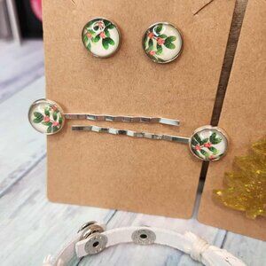 2 pairs of earrings 1 set of hair pins 1 snap bracelet with matching interchangeable snap