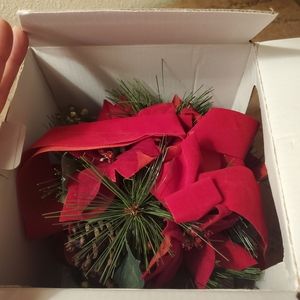 Red poinsettias, pine sprigs, pinecones, and bell hang from red velvet ribbons.