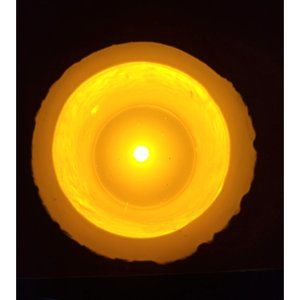 Printed gold Christmas words LED candle. Real wax and flickering LED lights. Needs double A batteries.