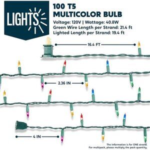 SUPER VALUE PACK. Our Christmas String Lights has a total of 100 Christmas Lights, Multi-color T5 Bulbs with Green Wire. 40.8W 120V. Total Lighted Length is 19.4 Feet. Total Wired Length is 21.4 Feet. Bulb Spacing 2.36 inches. High Voltage. Come with 2 extra bulbs & 1 replacement fuses & 2 testing flasher bulbs total.