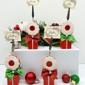 Add a festive touch to your holiday table with this set of 4 Christmas Linzer Cookie Place Card Holders. Each holder is handcrafted with a realistic hand sculpted clay linzer cookie design, sparkling with holiday cheer, and set on a red wooden gift box accented with glitter bows.