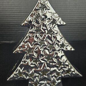 A celebrations Mikasa tabletop Ceramic, silver tone, LED, Christmas Lantern. This attractive shiny Christmas tree shaped Lantern has a multitude of small cut out stars on the front, back and both sides. When you turn on the switch on the bass, the tree has a warm glow and the stars shine bright. So cheerful. The front and back of the tree have a textured star design with star cutouts. The sides are smooth with a single cut out on each bough. Measure seven inches tall and one a half inches deep, 5 1/2 inches wide. Box shows some slight wear. The tree is is very nice condition. It takes two LR44 batteries that are included. Non smoking pet free home. @GTB#1