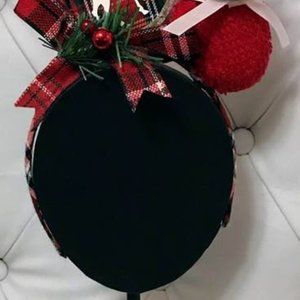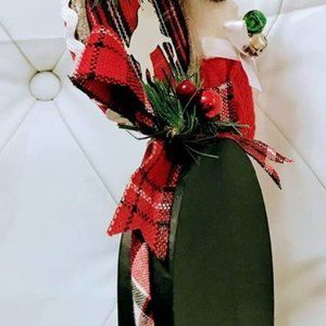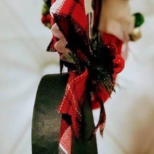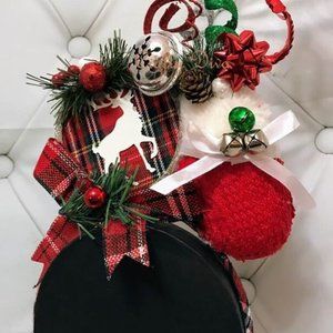 Materials: Bells, Ribbon, Bows, pinecones, sparkle balls, deer ornament, holly and mitten.