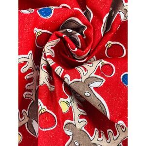 This Christmas Moose fabric is perfect for sewing and quilting projects. The red fabric features a whimsical design of a moose with colorful ornaments hanging from its antlers and a Rudolf reindeer nose, accented with a fine spray of sparkles. Measuring 1 3/4 yards, this remnant adds a festive touch to your holiday crafts. Ideal for creating unique quilts, apparel, or home decor, this fabric brings holiday cheer and a playful spirit to any project. Perfect for crafters and sewing enthusiasts looking to add a bit of sparkle and fun to their creations.