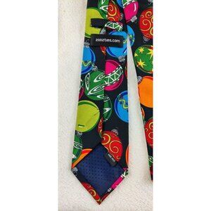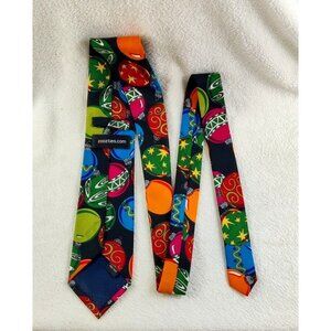 Handmade tie by 2002ties, with Christmas ornaments in multiple colors on a black background. Made with polyester and it great condition.