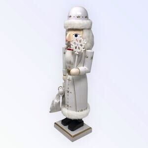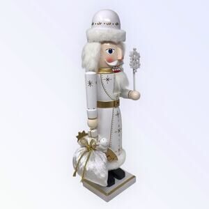 A traditional king nutcracker. Hand-painted collectible in white & gold finished with a faux fur-trimmed cape & hat. He carries a snowflake staff and a velvet bag filled with toys. A collectible heirloom-quality Christmas nutcracker.