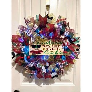 About 22 inches, 5 inch-deep door or mantle wreath. Red, Gold, and green mesh back. December/ Christmas themed w/ vibrant multi color wired ribbons (8 styles). “It’s Christmas SO LET’S GET Crackin” Wooden Nutcracker sign, matching mini bulb balls adorn this festive wreath.