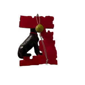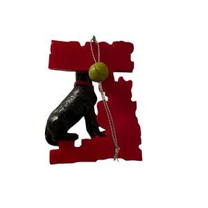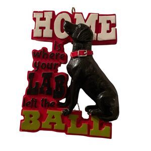 This Christmas ornament features a black lab sitting next to a saying that reads "Home Is Where Your Lab Left The Ball." The hanging ornament is made of plastic and is a part of the holiday and seasonal decorations collection. Perfect for those who love their furry companions and want to add a touch of whimsy to their Christmas tree. This ornament is a unique and charming addition to any holiday decor. Item 869