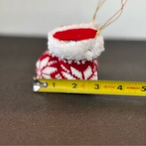 Christmas Ornament Knit Snow Booties 1 Pair Red And White. These booties are attached together to be able to drape them over the Christmas Tree branch. These are in very good pre-owned condition. Measures approximately 3x3.
