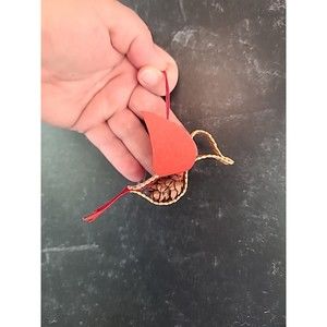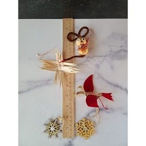 This is a set of 6 Christmas ornamentsof various sizes, made mostly of wood, in the shapes of snowflakes dogs, deer, a cross, and a bird.