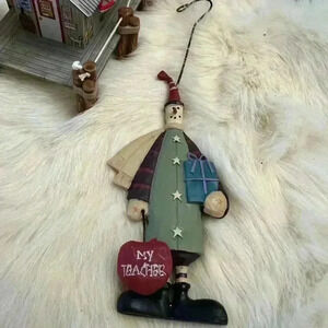 - Snowman ornament dressed in a plaid coat, scarf, and hat, holding a gift and an apple inscribed with "My Teacher"