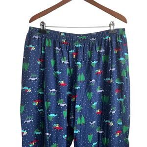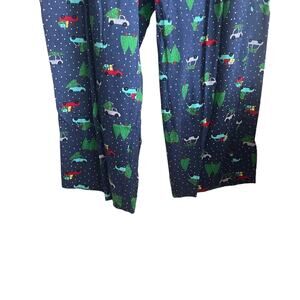 straight hem, crew neck red top, navy pants; novelty Christmas print, some stretch, pants - elastic waist