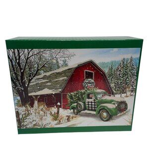 This Christmas Party oversized jigsaw puzzle features a charming winter scene with a green vintage truck carrying a Christmas tree, parked in front of a red barn decorated for the holidays. The artwork includes snowy trees, deer, and festive wreaths, capturing a cozy seasonal atmosphere perfect for puzzle enthusiasts and holiday lovers alike. The puzzle is manufactured by Christmas Party and contains 1000 pieces.