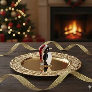 Charming and festive brooch shaped like a penguin wearing a red and white Santa hat. The body of the brooch is from enamel, adorned with sparkling rhinestones. It is designed as seasonal accessory, perfect for adding a touch of holiday cheer to clothing or other items