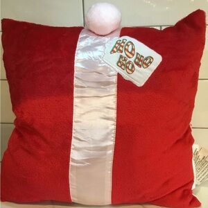 HO HO HO Vibrant red pillow with a pink stripe and pom-pom. Opposite side is covered with colorful red and green bows. NWT