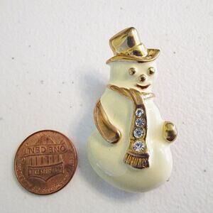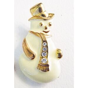 Christmas Pin Snowman Ivory and Gold Enamel Rhinestones Pin Brooch