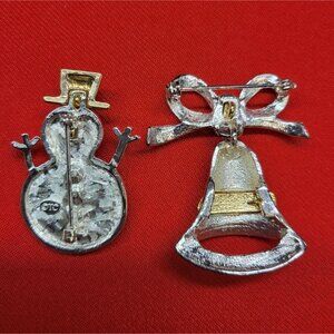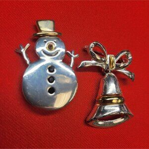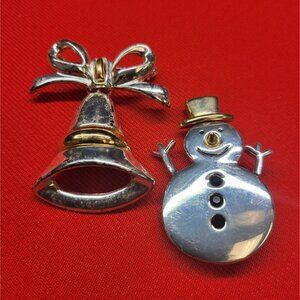 Christmas Pins Brooches Set of 2 Gold & Silver Snowman signed TC and Christmas Bell Pins