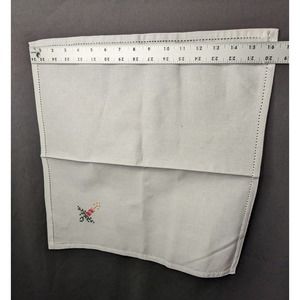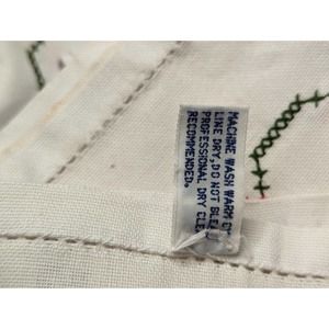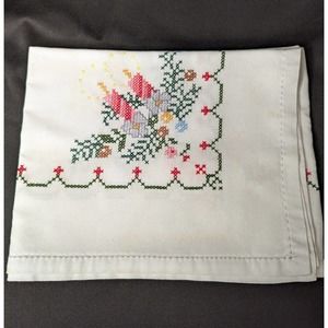 This is a beautiful set of Christmas linens with cross-stitch candle design. The place mats are a generous 14" x 20". The napkins are 16" x 16". The tablecloth is 32" x 40" with double candles in each corner and a single candle in the middle of each side. This is a vintage set that has never been used so it has some discoloration from being stored which should come out when laundered.