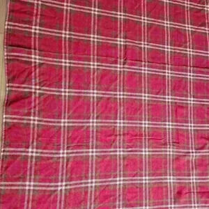Tablecloth is made of a thick cotton blend with off-white and green stripes on a rich red background.