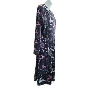 Add a dash of holiday charm to your wardrobe with this enchanting swing dress! Featuring playful reindeer and tree designs in festive hues, it's an outfit fit for every merry occasion. Its cozy long sleeves, flowing A-line silhouette, and hidden side pockets blend practicality with seasonal flair for all-day comfort.