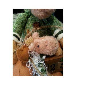 Adorable large plush moose with smaller moose at front of wood sled with metal runners. On the front of the sled are removable blocks in order to change the day date calendar.