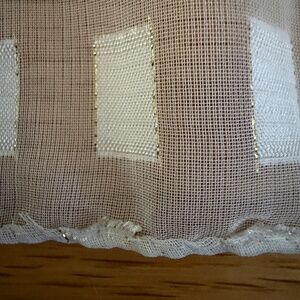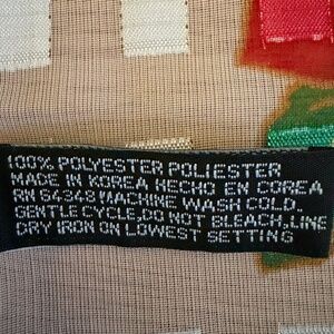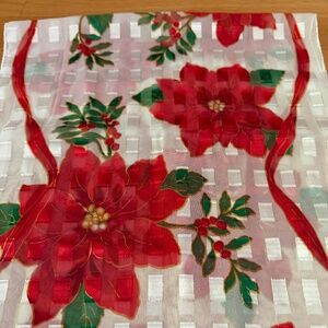 Christmas Poinsettia Scarf Rectangular Made in Korea 57.5"L X 13"W. 100% polyester scarf with a bright white background with vibrant red poinsettias, green leaves and holly branches and red ribbon. Thin gold lamé threads run through the scarf. Rolled edges. Backside looks identical but is not quite as bright (see last pic.) Excellent condition with no holes, runs, or tears. Measures: 57.5" long and 13" wide.