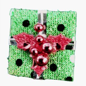 Christmas Present Pin Brooch Green Gift Package REd Ribbon Holly Holiday Jewelry