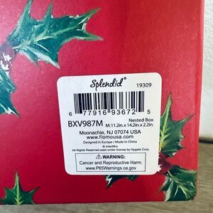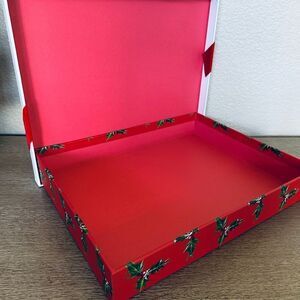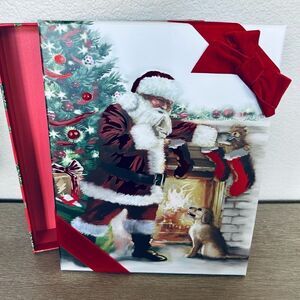 NWT puppy dog and Santa Claus sturdy rigid rectangular Christmas tree fireplace scene gift box or storage box with lid. Red velvet bow attached. Also looks great as decor underneath the Christmas tree! Contemporary style.