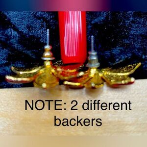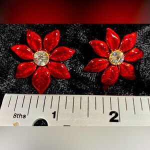 Christmas Red Enamel Poinsettia Rhinestone Center Pierced Earrings Gold Tone