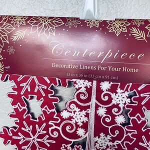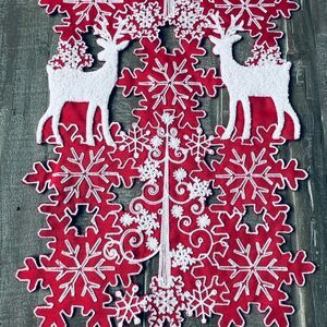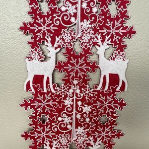 NWT Christmas holiday red and white embroidered cutout snowflakes and reindeer or deer pattern oversized table runner or centerpiece mat. Can also be used on a side table, console or buffet table. See photos for size.