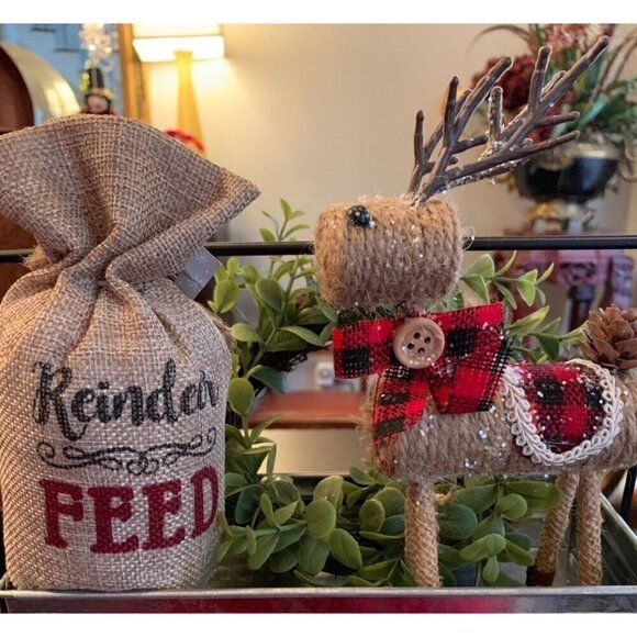 Christmas Reindeer Feed Sack Buffalo Check Set Rustic Farmhouse Holiday Decor