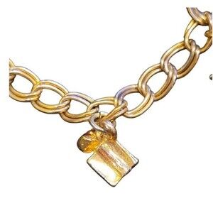 Christmas Reindeer Sleigh Present Teddy Bear Holly Bell Charm Bracelet is a festive and charming accessory perfect for the holiday season. The gold tone charm bracelet features traditional charms in the shape of a reindeer sleigh, teddy bear, and holly bell, all crafted from enamel material. The lobster closure ensures a secure fit, and the round link chain type adds a touch of elegance to the piece. This 6.5-inch bracelet is a lovely addition to any Christmas outfit, adding a touch of holiday cheer to your ensemble.